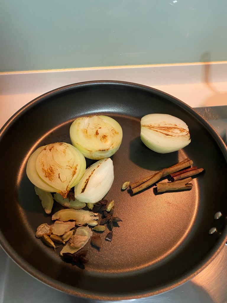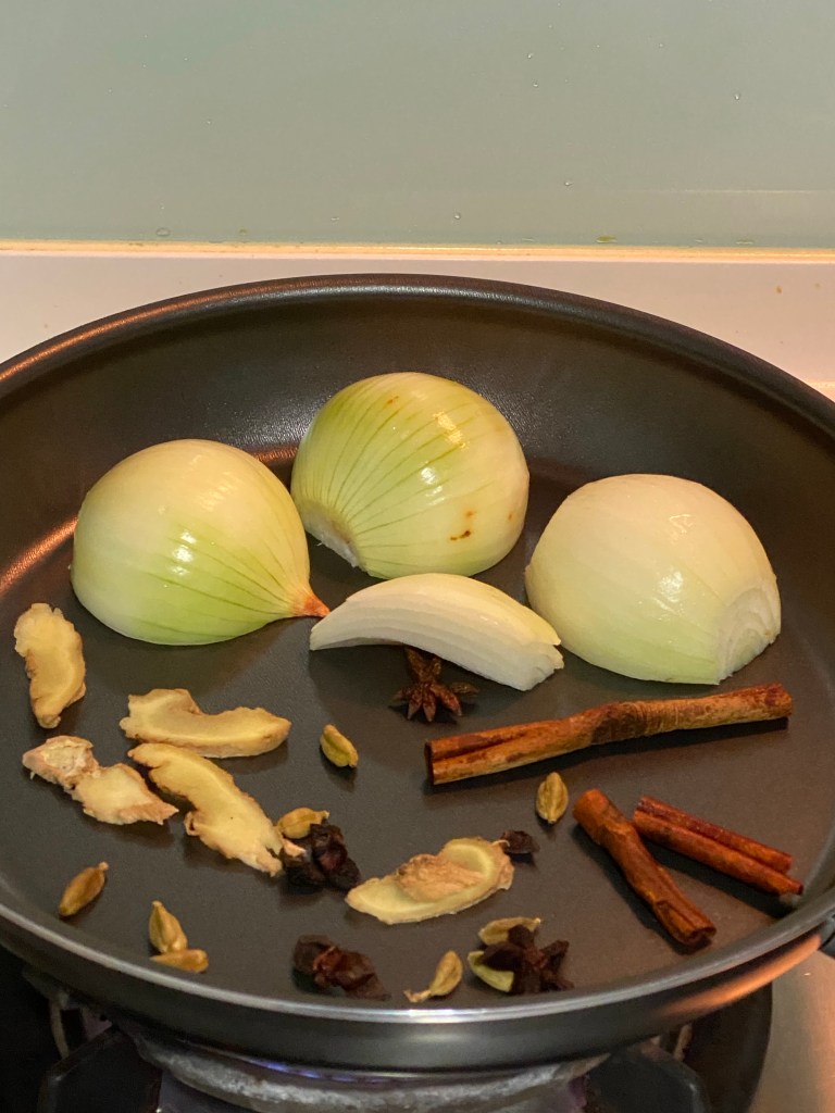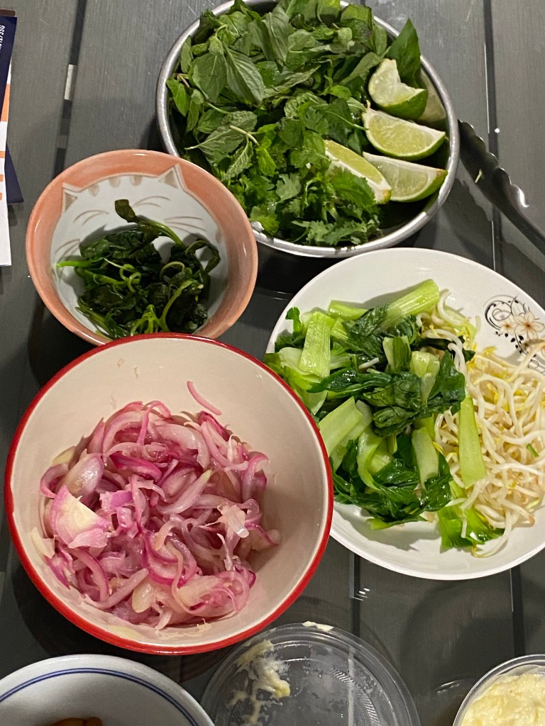 It is a one of my family favourites. It is also possible to be done very deliciously without alliums but my family likes it. You can remove it and replace with fruits in the soup. More importantly the other spices are there. It is normally served with kway teow, garnished with mint leaves, basil leaves,pickled onions and lime slices. It is meant to have a herbal smell with a tinge of sourness from the lime and a very flavourful soup from the fruits and vegetables used to flavour the soup. It’s my husband and elder son’s all time favourite and mine. When you are sick especially, these type of food is what you would crave for. (这道菜通常在越南用牛肉来做汤底。可是我们可以把它变成素的。好吃又不伤害众生。这道菜在我家里可是很热爱的。那些吃纯素的人也可以做,不放葱也是很好吃,放多点蔬菜水果在汤里代替葱也可以的,主要的其它香料不可缺少。通常它的汤是倒在一碗粿条里,上面的伴料有薄荷叶,九层塔,豆芽,您喜爱的菜,酸酐,腌过的洋葱。它是那种汤有很香的香料味道,汤带着水果蔬菜甜味,非常的开胃,健康,因为它里头的薄荷,九层塔都是有医药价值的。生病时,感冒时,不舒服时,这种食物是您期待的。