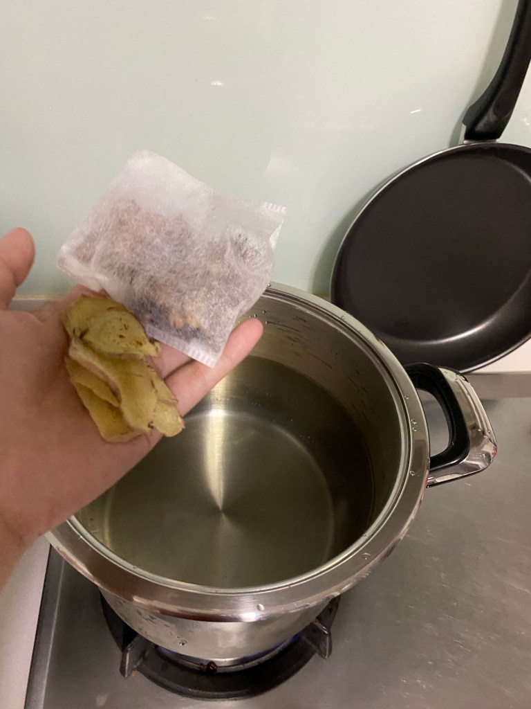 5.) Put in spice bag done in A and the 2 roasted onions and boil it for 3 hours on low fire. (把在(A)准备的香料和2烤过的大葱,放进去汤里慢滚3 小时)