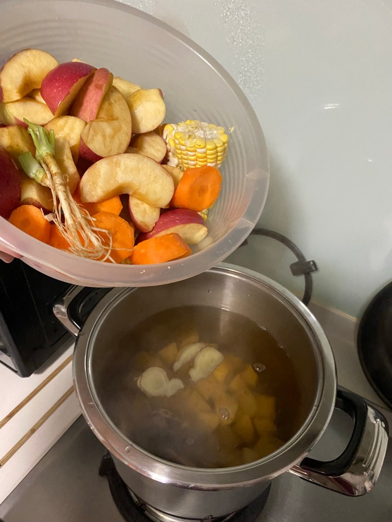 any other veges like corn, cabbages and balance fruits like pears and apples can go in, ,makes soup only sweeter. (自己家里所有蔬菜🥬水果剩下的,苹果,🍐,都可以放来增甜汤底。)