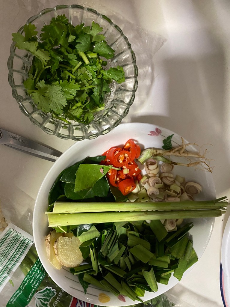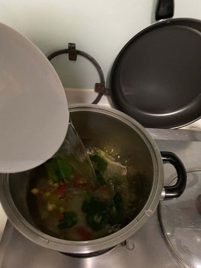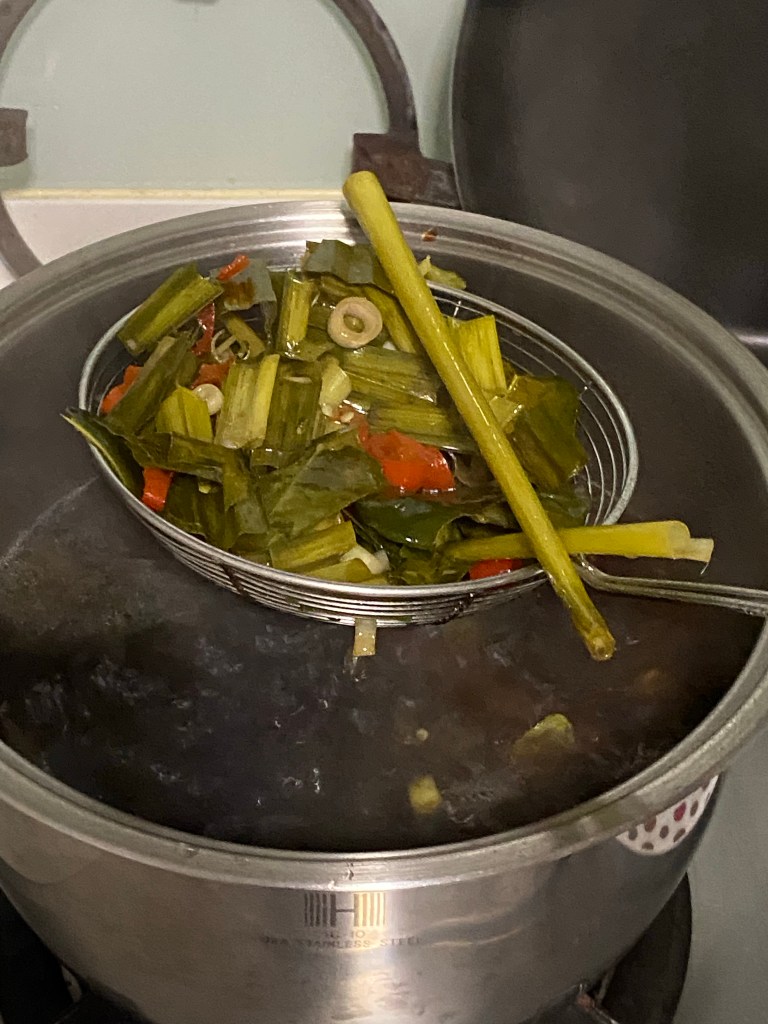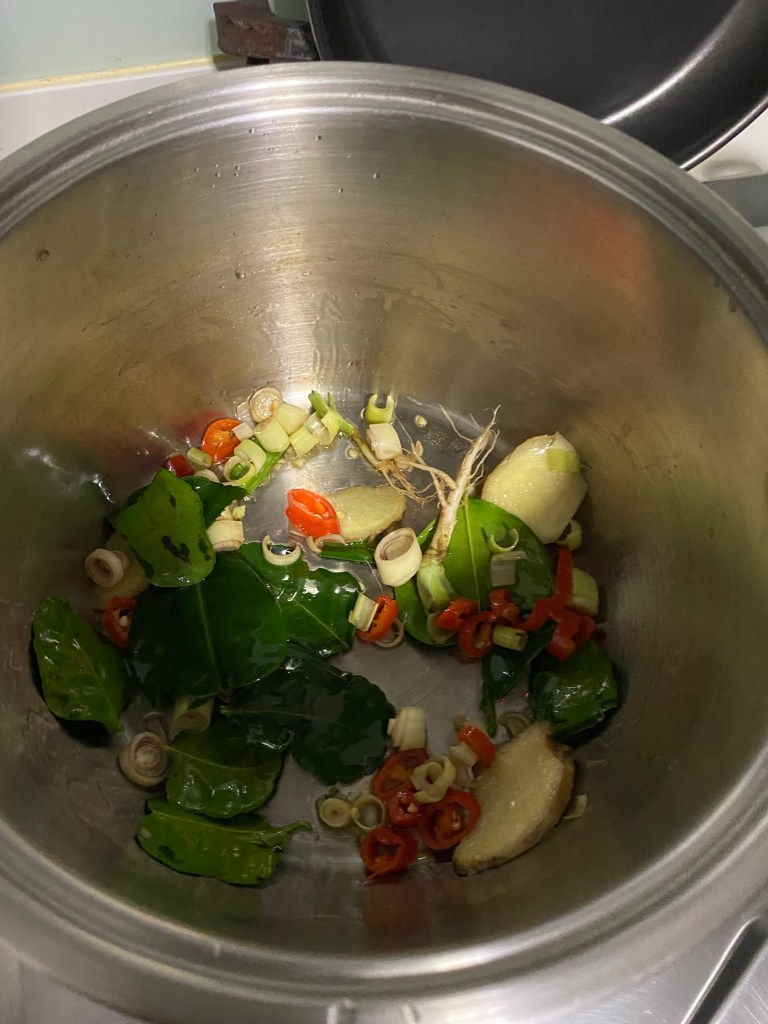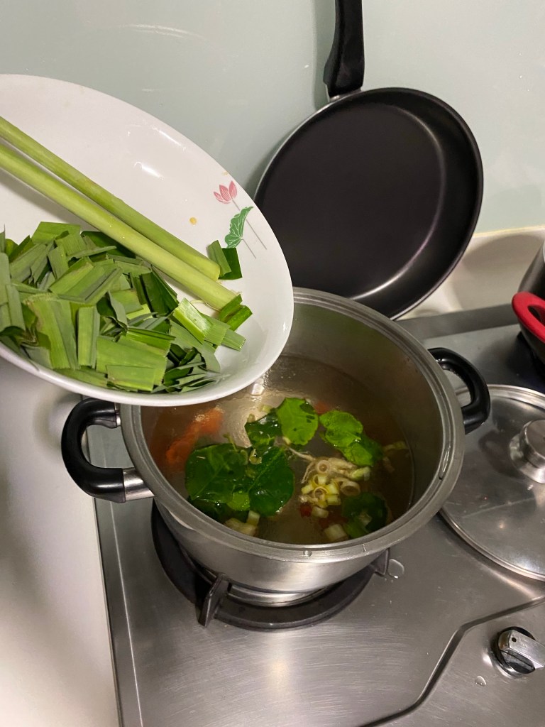 3.) Once boiling add in the lemongrass tails and the Pandan leaves. Boil for 20 mins on slow fire.