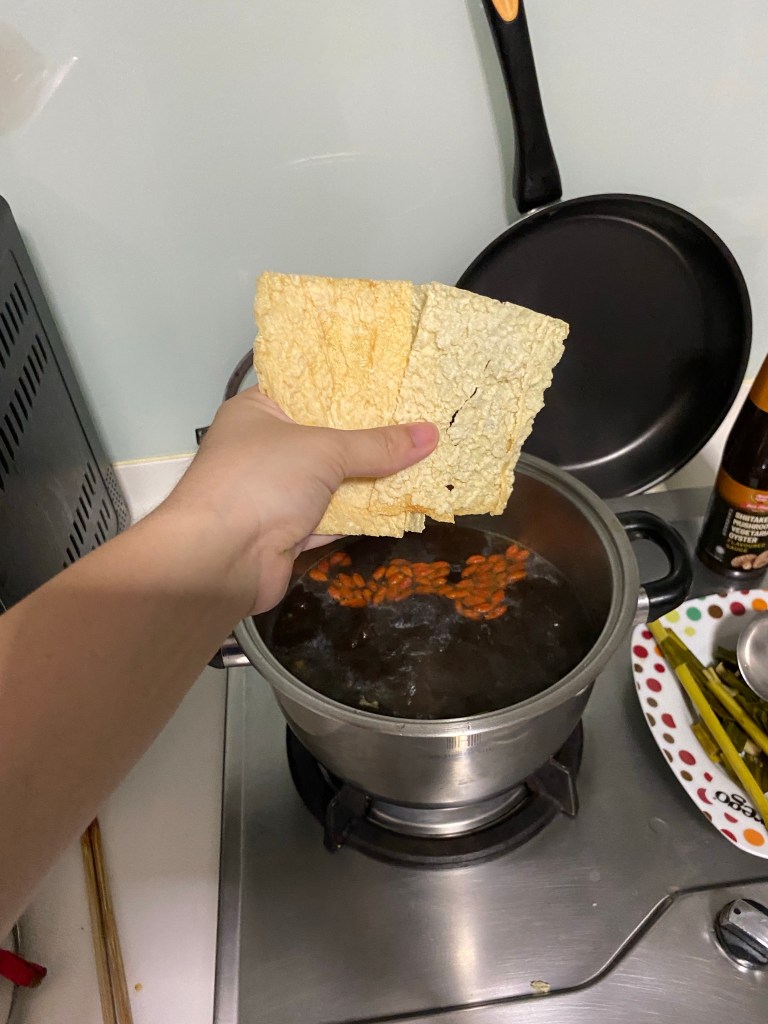 5.) Add in the golgi berries, abalone mushrooms and crispy beancurd skin. You are free to use other ingredients of your choice here.