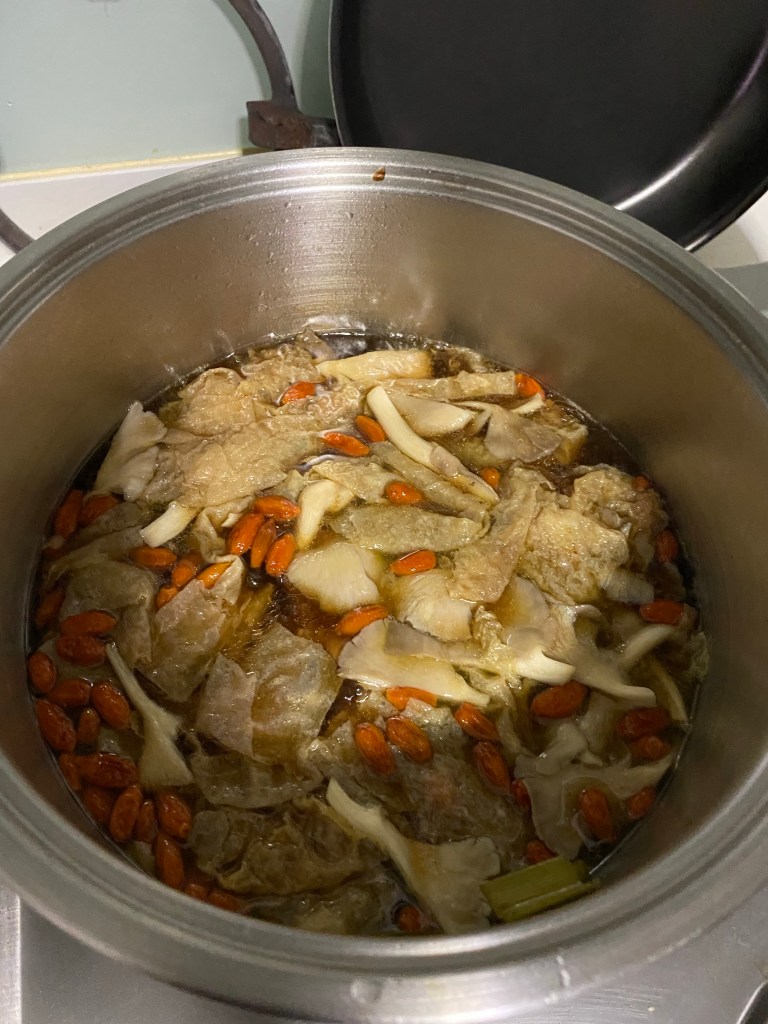 最后才加入枸杞子,撕好的鲍鱼菇,炸的腐竹。