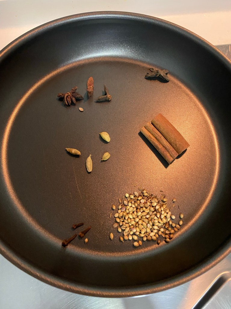 桂皮 (两小条)cinammon 2 short sticks 孜然种子 (1/2茶匙)cumin seeds 1/2 tsp 香菜种子 (1茶匙)coriander seeds 1 tsp 八角茴香 (2粒)2 star anise 丁香 (3粒)3 cloves 青色豆蔻果实 4 green cardamoms