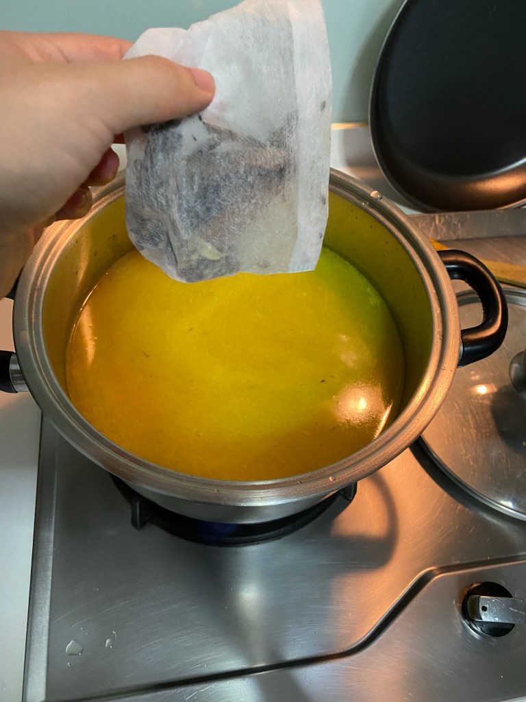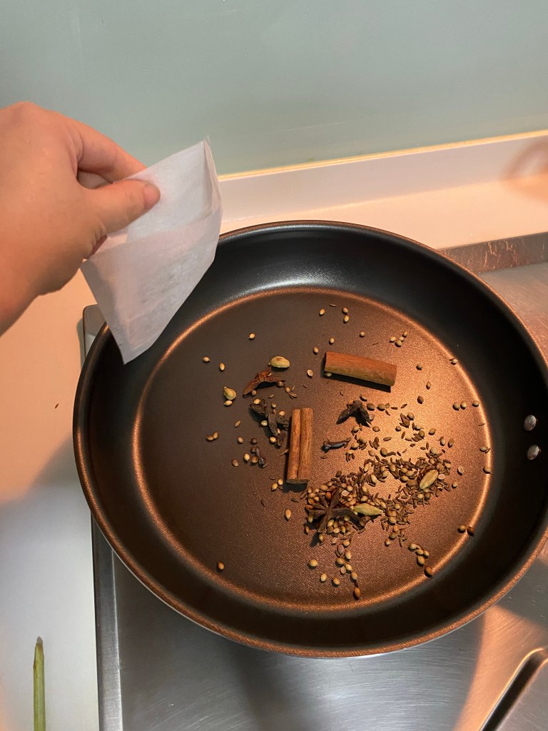 把所有干的香料炒的香位置。把它装进香料包。 (Put all in A onto a frying pan and roast them without oil until fragrant and crackling, then put into the spice bag for later use)