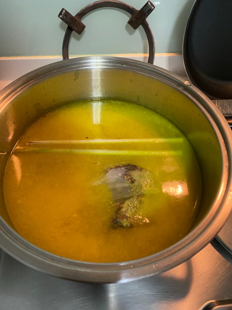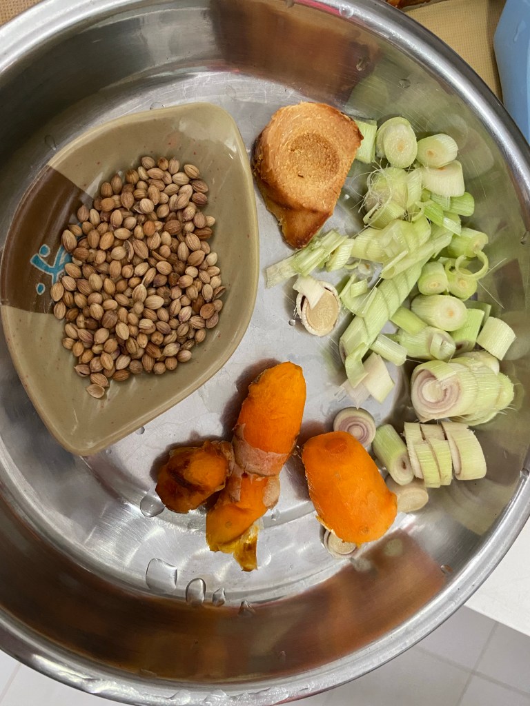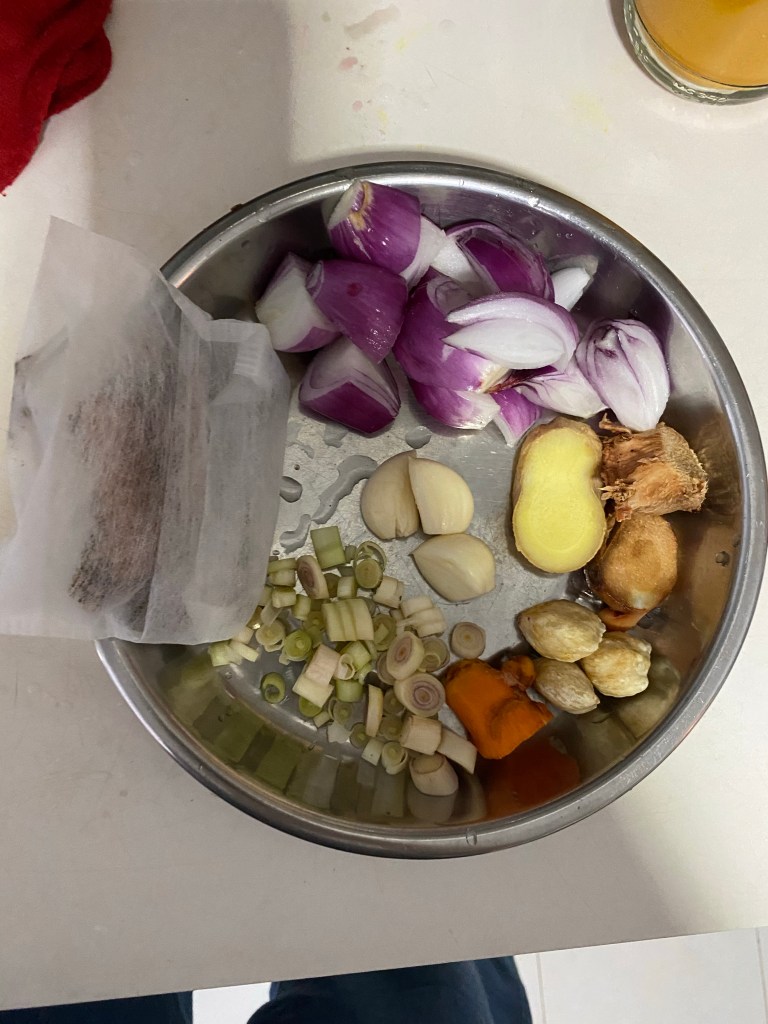 2大葱 2 big onions 2香茅 2 lemongrass 一些南疆(看照片)galangal (see photo) 一些姜片(看照片)ginger slices (see photo) 一些黄姜 (看照片)tumeric (see photo) 3粒烛果 3 candlenuts