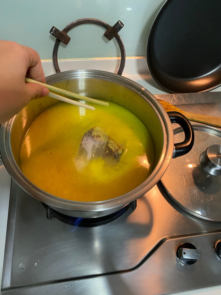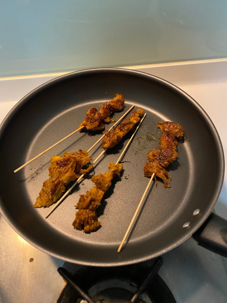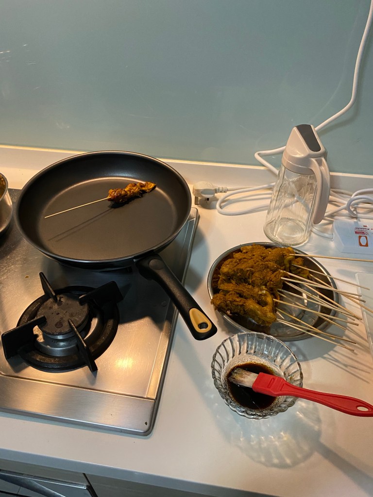 I don’t have a proper griller, so I thought of a way which was to use the stove and a frying pan to grill my satay and bast and flip my satay with Kicap Manis and oil.