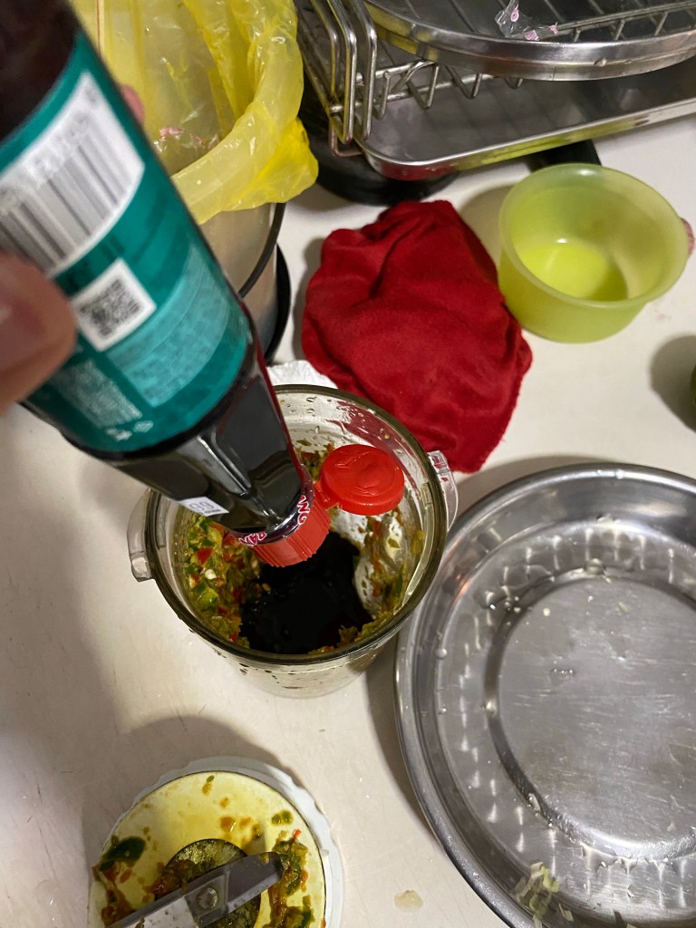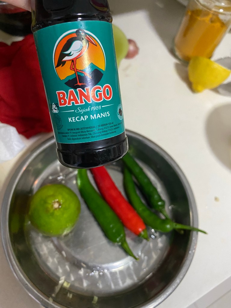 75ml Kecap manis 3 条青辣椒 3 green chilli 1条红辣椒 1 red chilli 一点酸酐挤进去 some lime squeezed in 一点的糖 some sugar 一点的盐巴 some salt Put all into a blender, blend it and taste it and adjust the seasoning and then you can use it. (放在搅拌机里,搅拌一下子就好,舔一舔,看哪里需要调味,调好就可以用了)