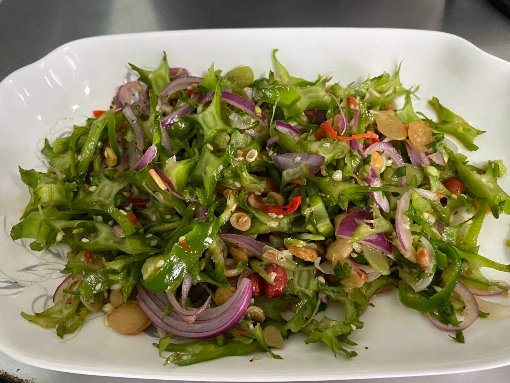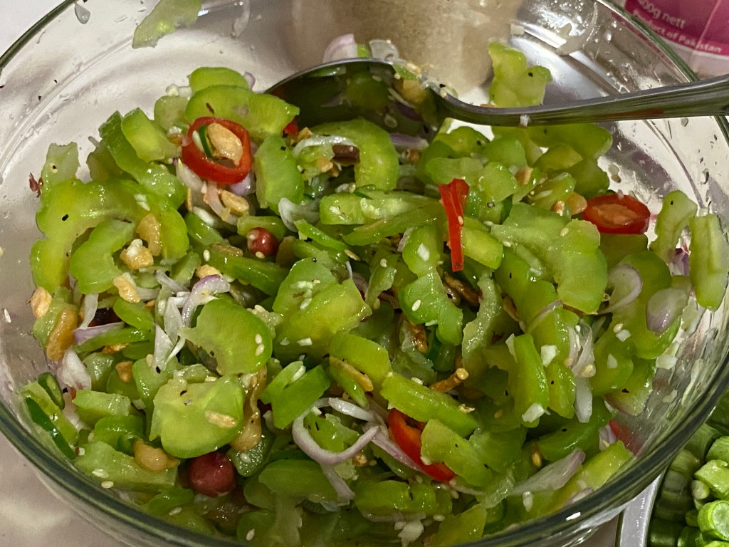 Where Philippines meets Burma. I combined the Pinoy Ampalaya-Kinilaw salad with the Burmese fried nuts. The trick is to get the bitterness out of the bitter gourd by salting it and leaving it in the fridge for 20 mins. Once done, I put water in it, squeezed out all the bitter gourd juice into the water, rinse it thoroughly and then squeeze off excess water so you don’t get watery salad. (翻譯) 這道菜餚是菲利賓的 Ampalaya 薩拉。我把菲利賓的做法和緬甸的做薩拉方法結合在一起。我是在新加坡🇸🇬 peninsula plaza 購買緬甸的食品。如果在您的國家沒有,也無所謂,可以用自己炒過的豆類如花生🥜,馬豆,腰豆,青豆等…翻炒在油裡取出來放一邊做薩拉用。