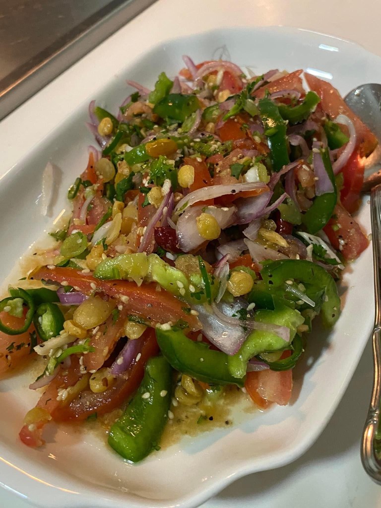 料理方式: 1.)把準備好的青椒🫑和番茄🍅。記得番茄的裡面不可以用。我們只取它外面的肉。 Prepare the cut capsicum and tomato rind. Remember that we don’t use the pulp of the tomato as it makes watery salad that’s not nice. 2.)放鹽巴 Salt your tomatoes. 3.)放白米醋 Put some white rice vinegar 4.)放香料,用穿手套搅拌均匀。 Put in all the spices. 5.)放调味-糖,柠檬汁,胡椒粉,白米醋。自己要慢慢的试一下,慢慢的调味才做的好。 Season with sugar, lemon juice, black pepper, vinegar. Do it slowly as you taste. That way you will be able to adjust the seasoning well. 6.) 调味最后才加炒过的豆类搅拌就可以上盘了!豆类要新鲜才好吃。after all seasoning is done then you add the roasted nuts. Give it a mix with your gloved hands and it’s ready to be served!