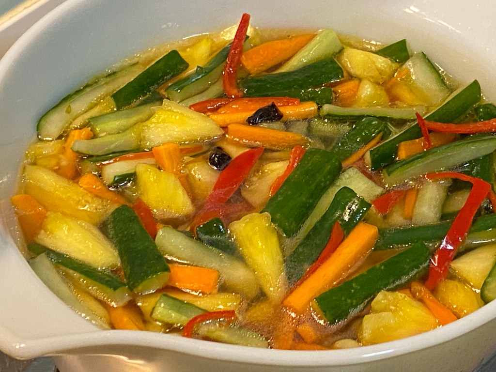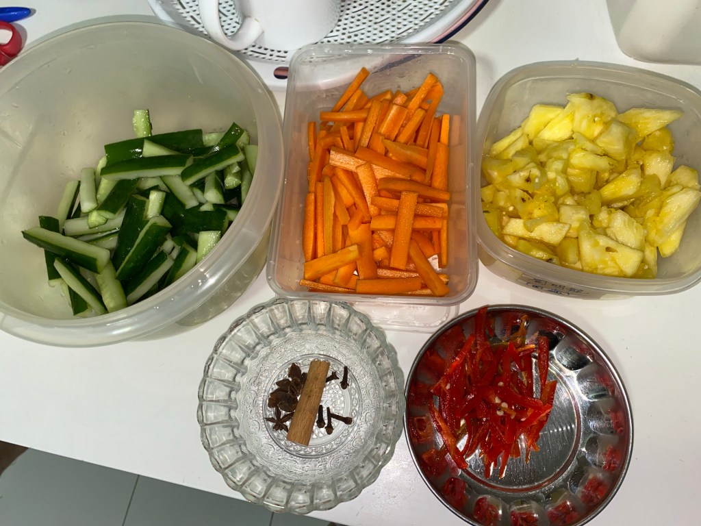 4.) when the solution cools down, pour them over your cucumbers, pineapple and carrots which will be stored in glass bottles as vinegar is corrosive, don’t keep them in plastic or metalware. Put the archar inside the fridge and keep it there for 24 hours before it is consumed.