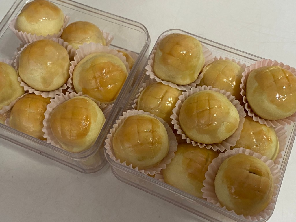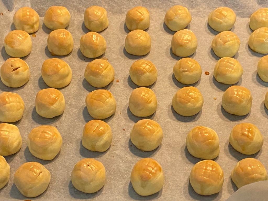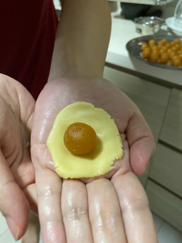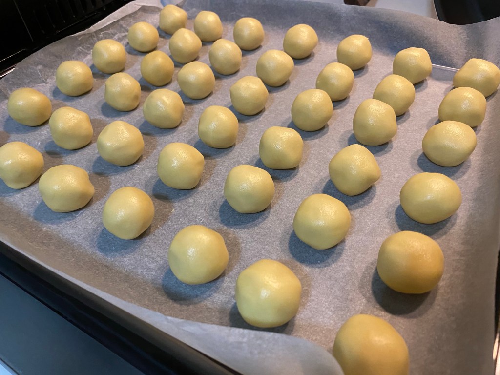 Dough is pinched into 11g. To wrap around 8g pineapple balls.