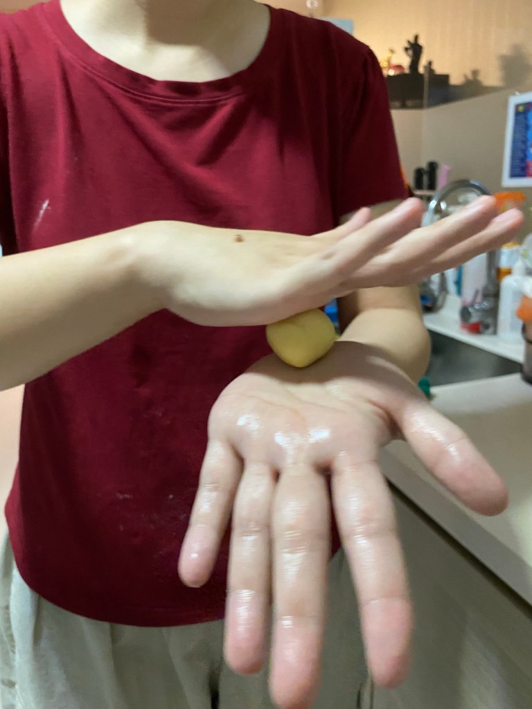 那出11克的面粉用手把它做一粒圆形,按下去再放8克的黄梨膏,包起来,再用手揉一揉到它圆圆的。