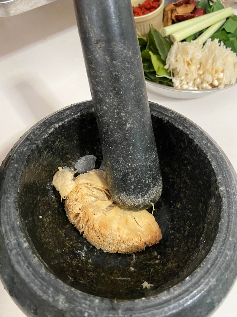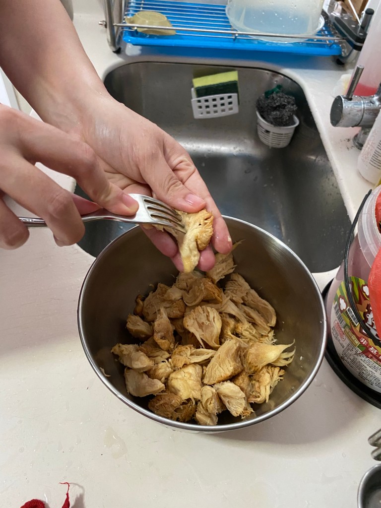 How to prepare the hericium mushroom for marinating is like you are marinating a piece of meat. You need to tenderize it by bruising it like below. Then tearing it into small parts.
