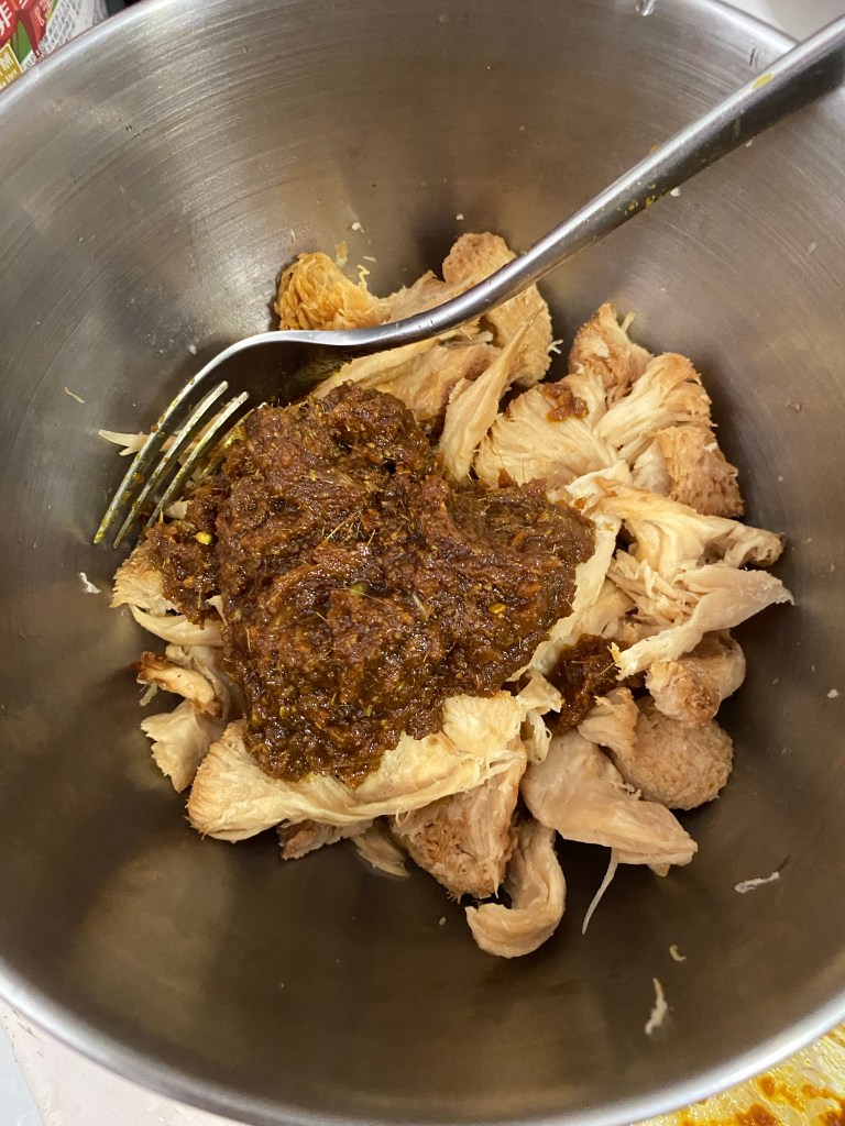 好了在用个叉子叉上很多的洞。才加上之前准备的香料膏,见拌均匀放进冰厨,2个小时候备用。 After you are done tenderizing the mushroom, poke it with many holes using a fork and then finally add the paste, mix it evenly and leave it in the fridge to marinate for 2 hours.